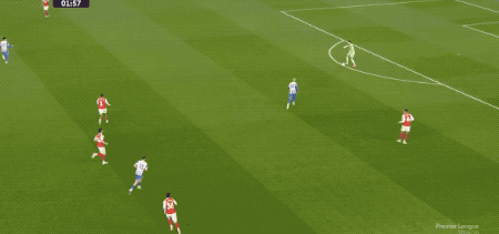 比赛仅仅开打3分钟,主队布莱顿就险些给领头羊一记闷棍。巴莱巴前场断球后看到拉亚出击,果断吊射,皮球划出一道诡异弧线直奔球门,好在加布里埃尔回追到门线完成关键解围,把场边的阿尔特塔吓出一身冷汗。