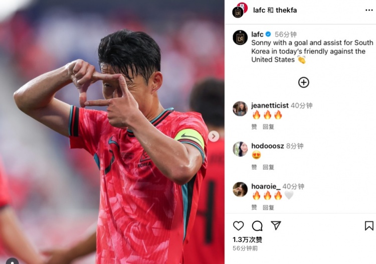 赛后韩国足协与洛杉矶FC在ins同步发布孙兴慜标志性"拍照"庆祝画面,配文称:"Sonny在本场对阵美国的友谊赛中完成传射建功。"