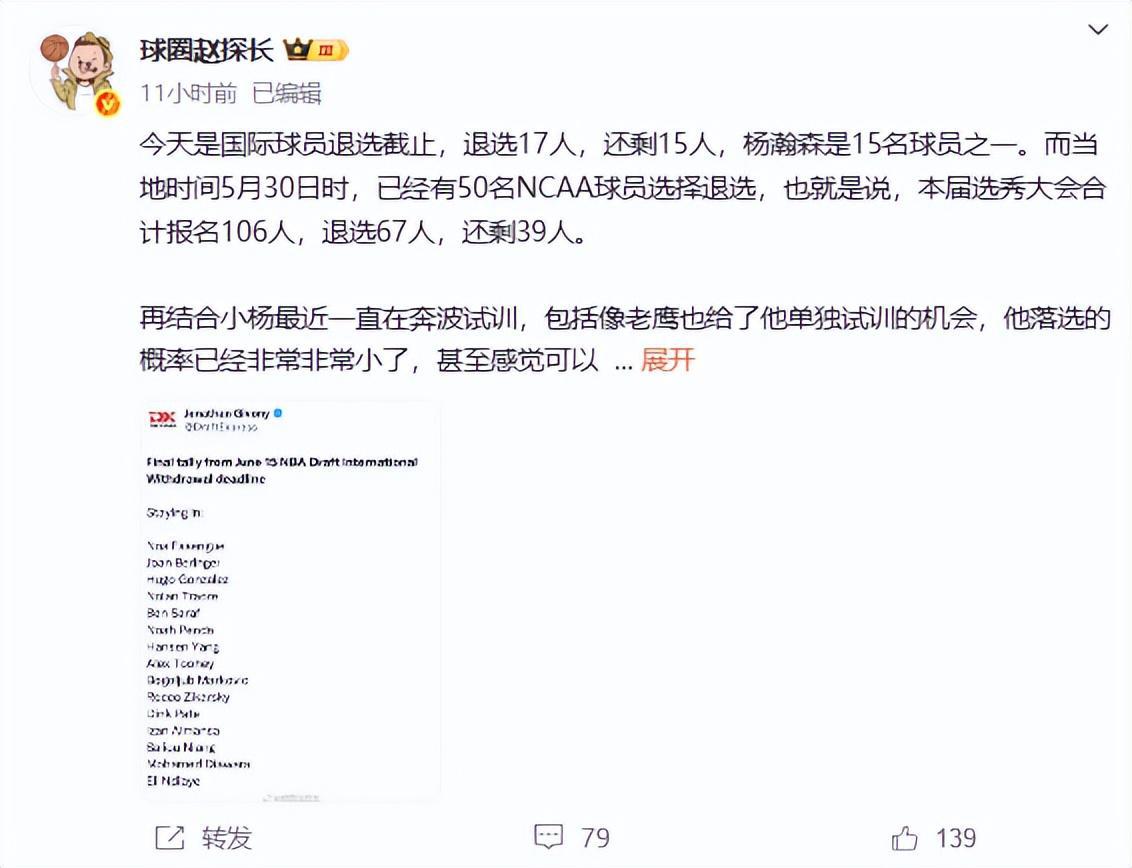 6月16号,NBA选秀大会最终退选的截止日期到了。对此,资深媒体人@球圈赵探长曝杨瀚森落选NBA的概率很小,直言甚至可以期待一下首轮。