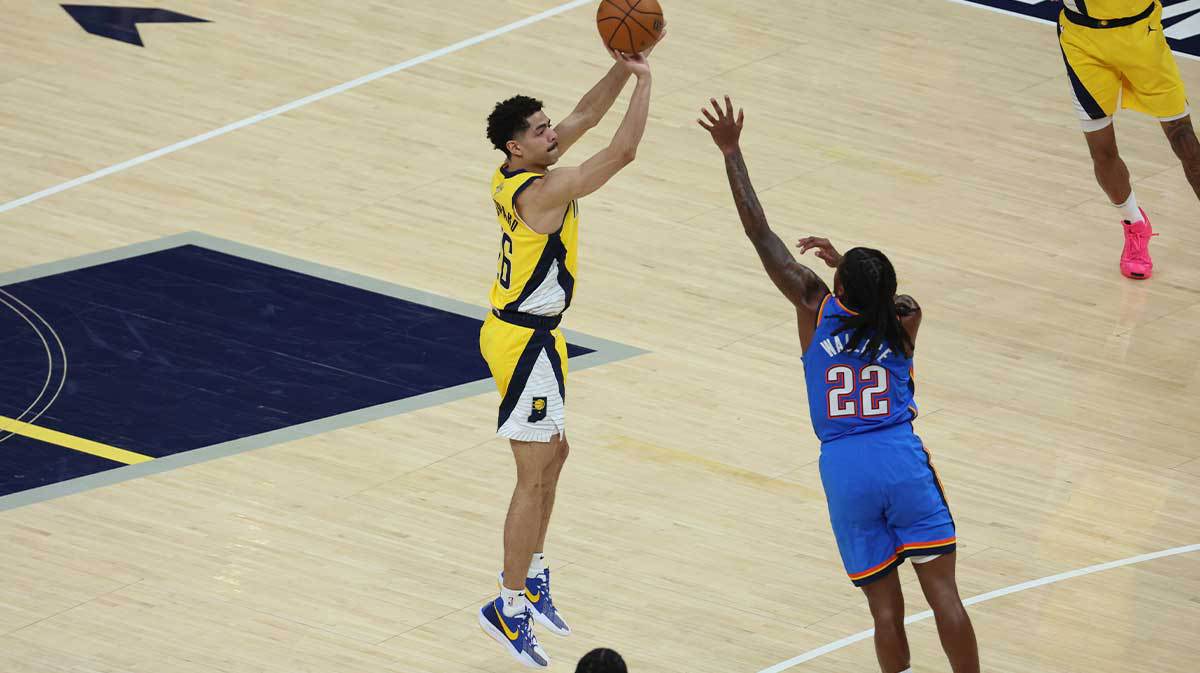 周四晚,在步行者队和雷霆队第六场比赛的第三节结束时,本·谢泼德投中一记压哨三分球。