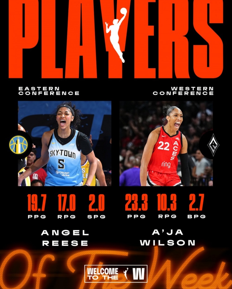 官方:安吉尔-里斯和阿贾-威尔逊当选第6周WNBA东西部最佳球员